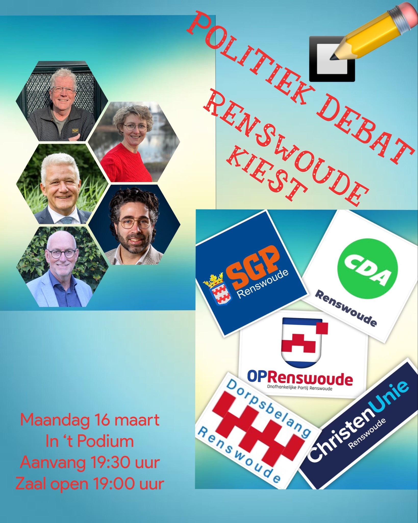 Op 16 maart organiseert de Gemeente Renswoude een politiek debat in 't Podium. Dit debat begint om 19:30 uur en de zaal gaat om 19:00 uur open. De betrokken partijen zijn SGP, OPR, Dorpsbelang, ChristenUnie en CDA.